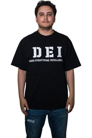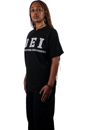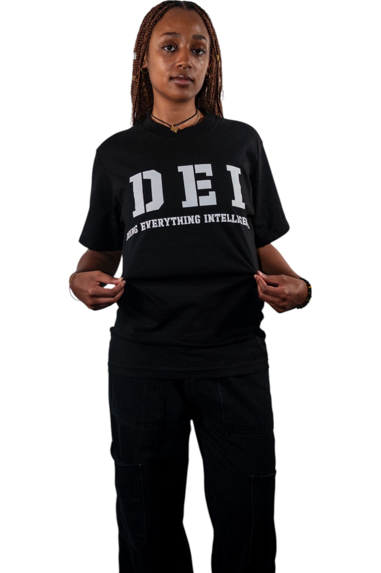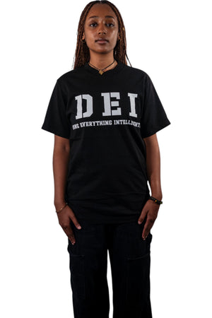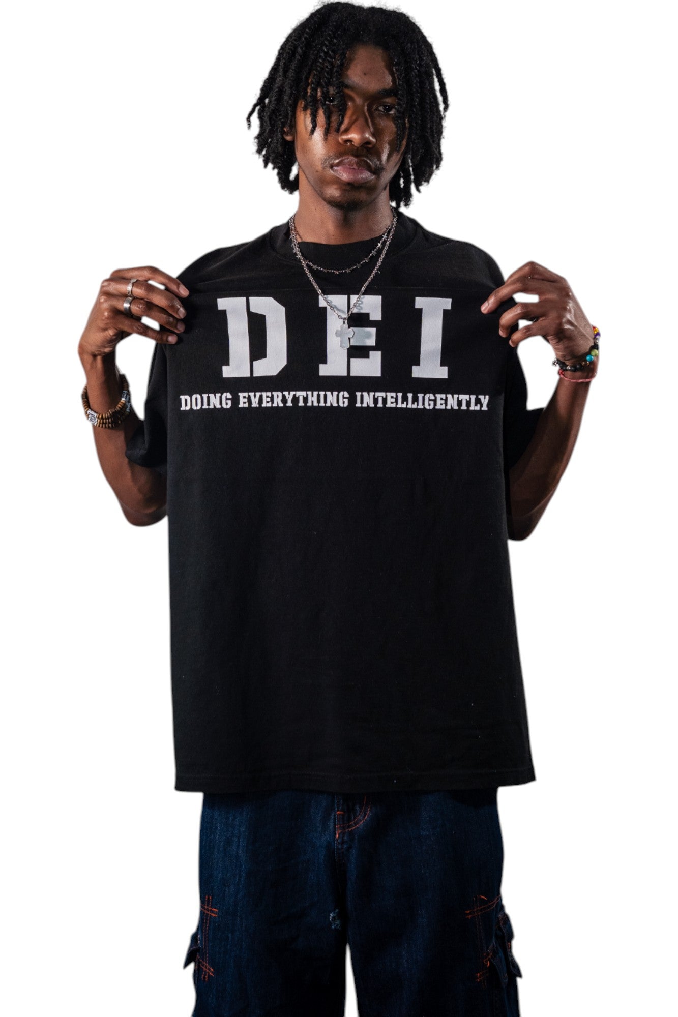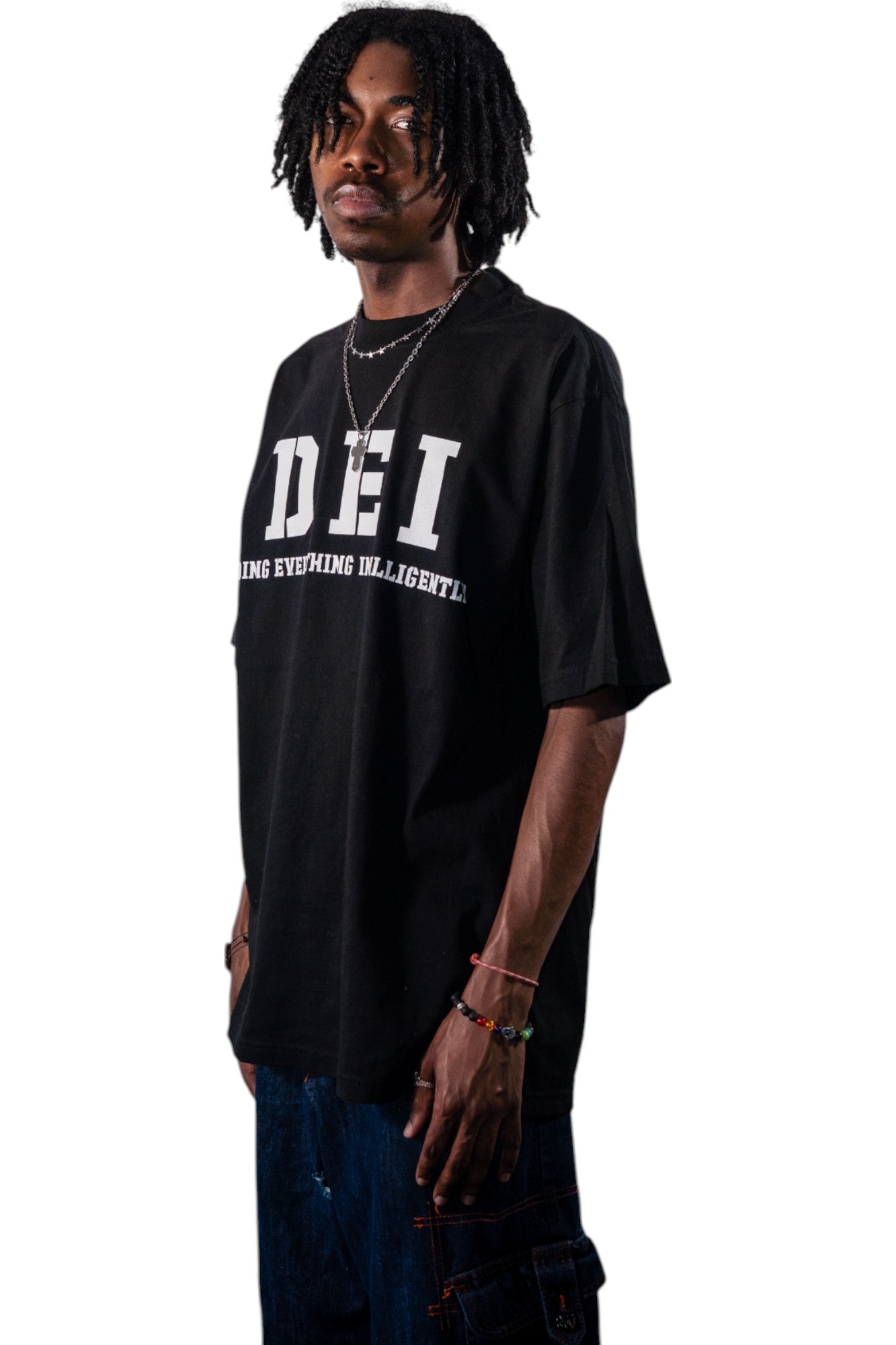 Heavyweight cotton jersey true-to-size T-shirt. Screen printed DEI text at chest. White text detailing.