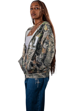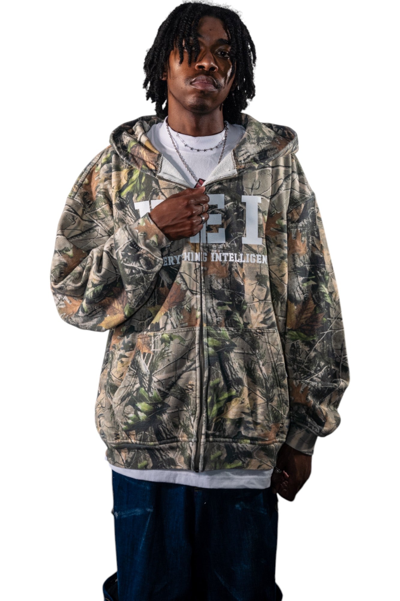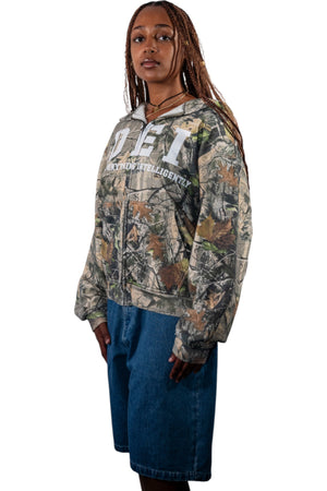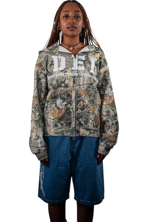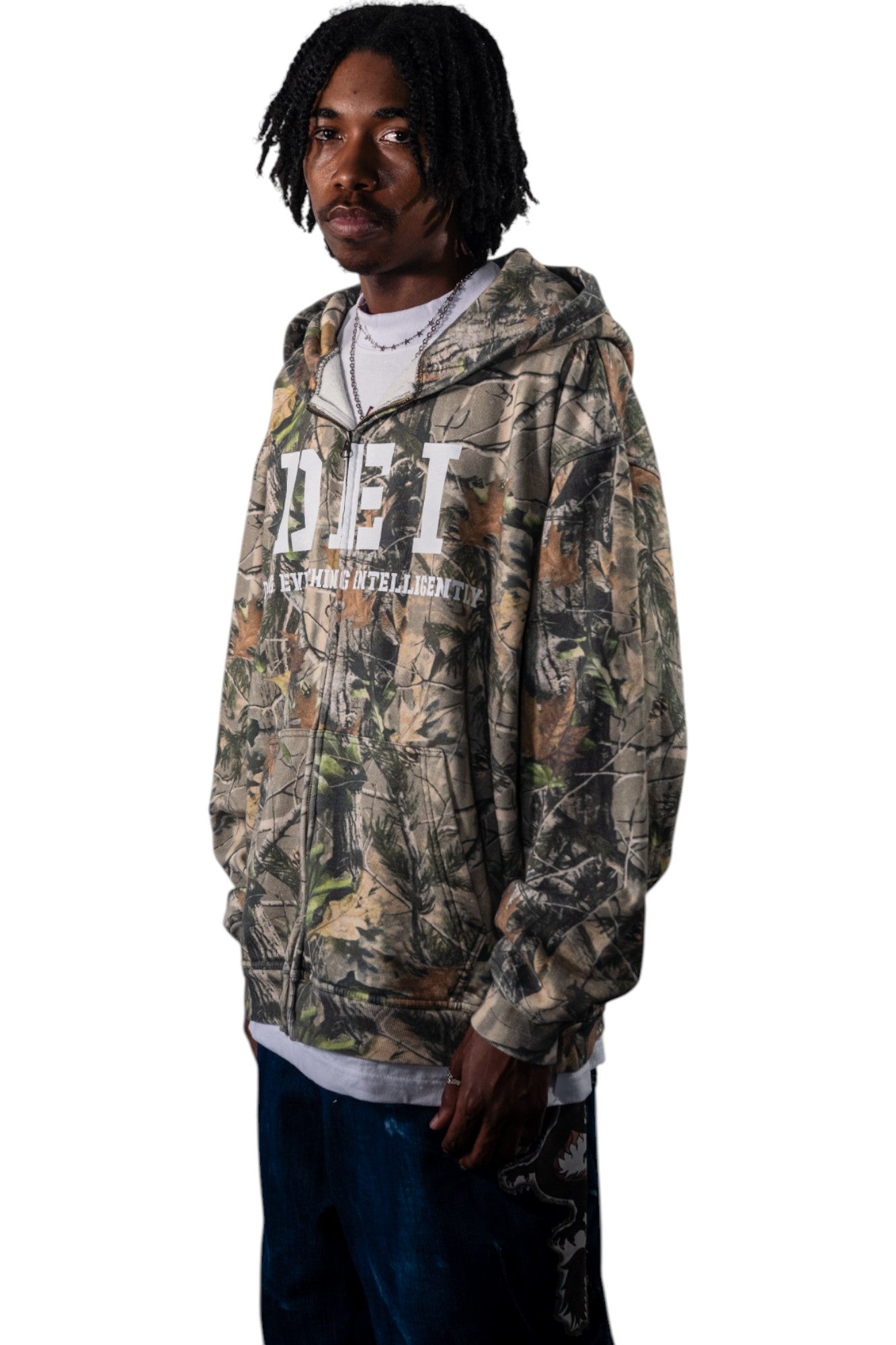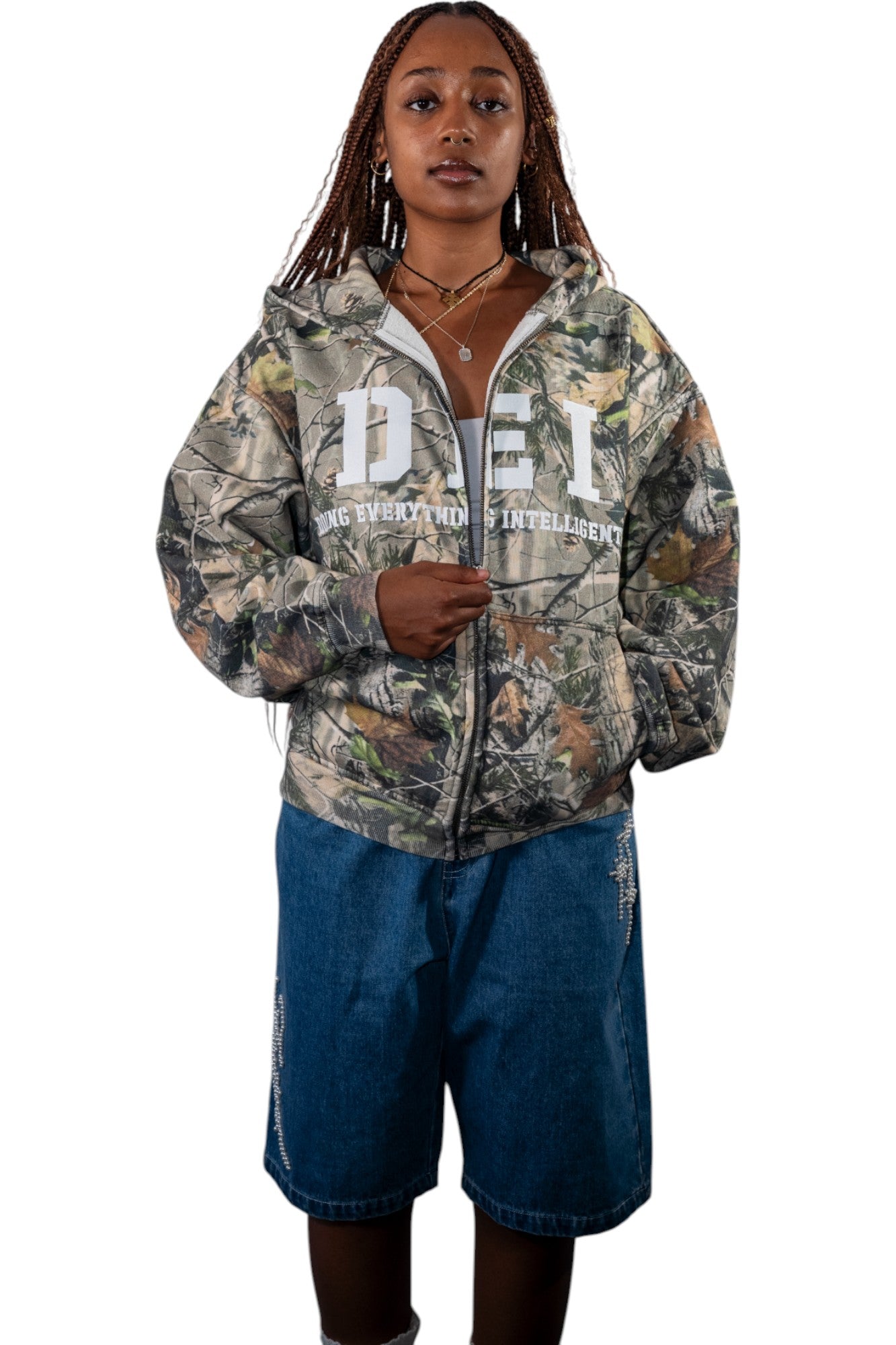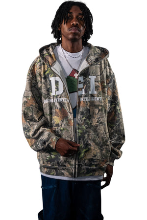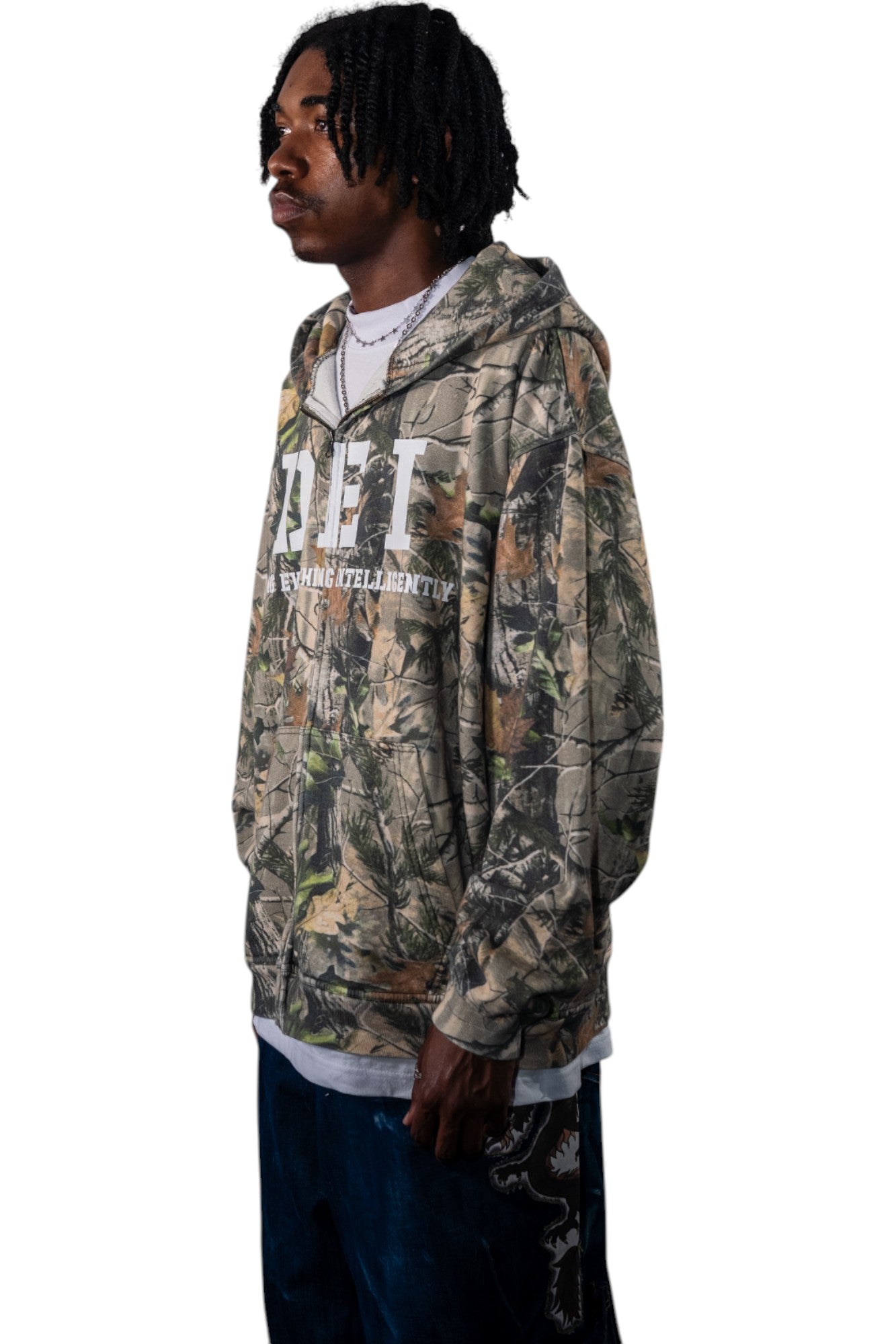 Oversized cotton fleece hoodie with military-inspired DEI motif. Distressed edges for a vintage finish.